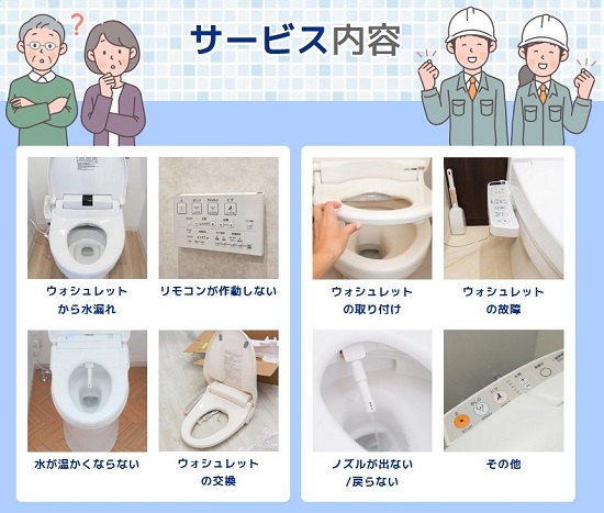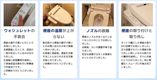 宝塚市で対応可能な温水便座、ウォシュレットの修理サービスとなります。その他のトラブルやご相談に関しましてはお気軽に受付窓口までお問い合わせください。